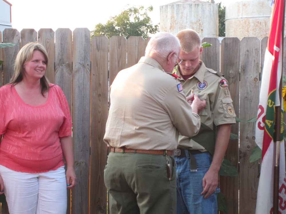 Thomas' grandfather presents the Eagle Scout Rank during the outdoor court of honor.