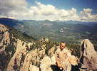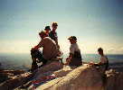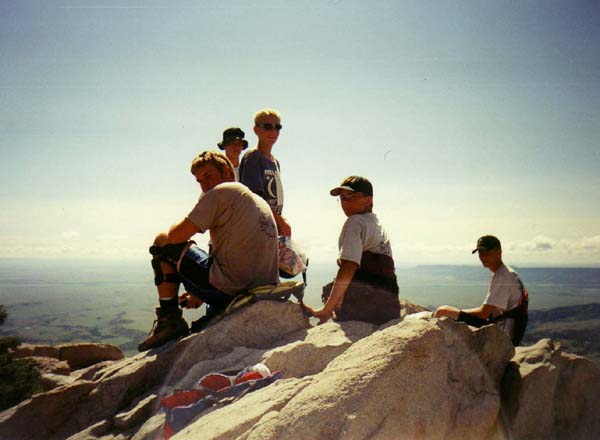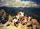 The whole crew poses for a shot on the Tooth Of Time. Baldy Mt. is in the background.